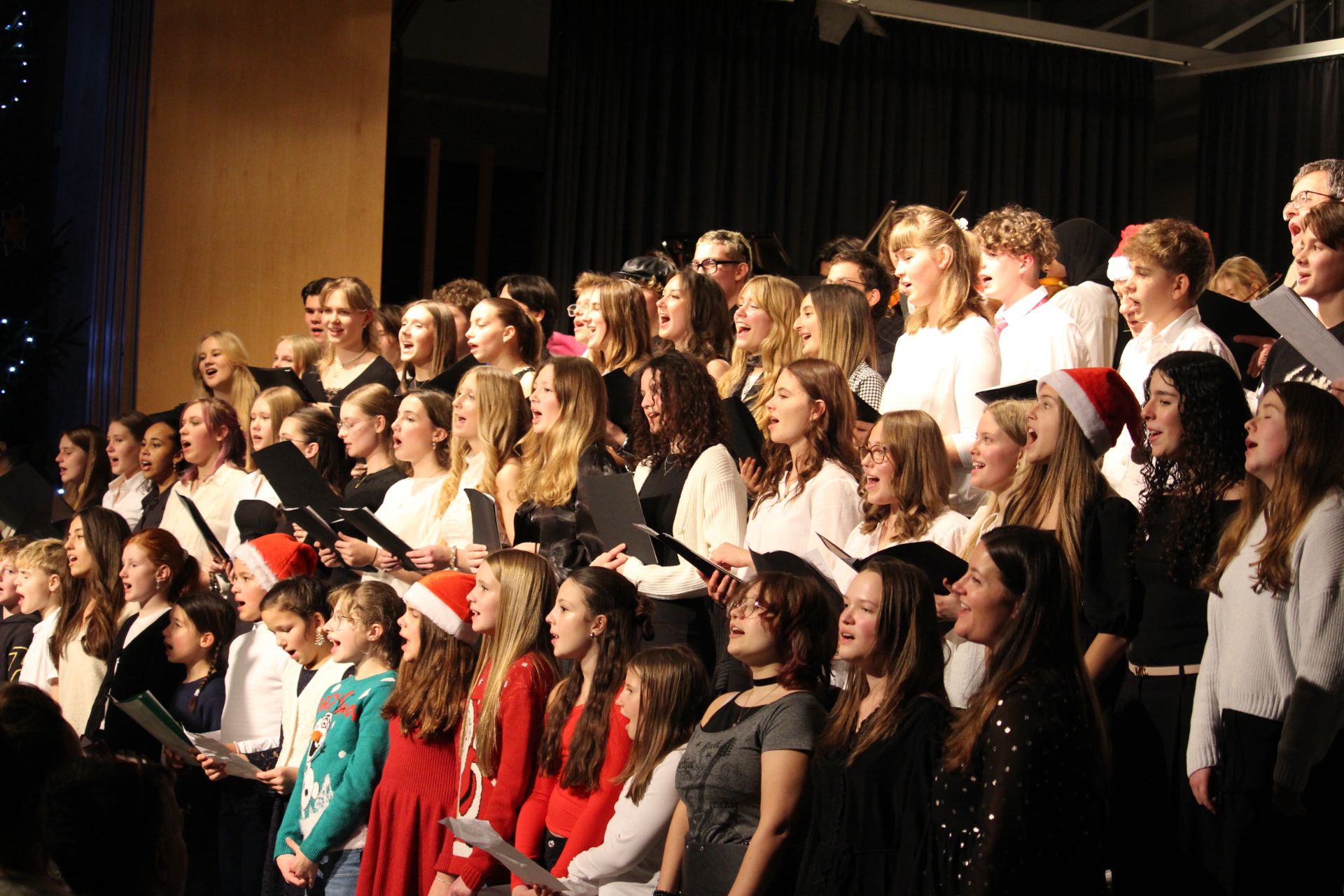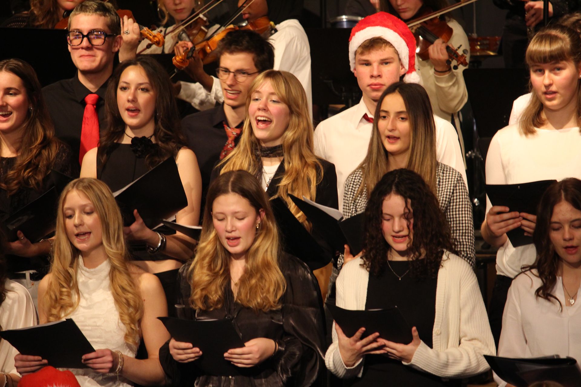 Der Oberstufenchor setzte starke Akzente: John Rutters „Star Carol“, das traditionsreiche „God rest you, merry gentlemen“ und schließlich John Lennons und Yoko Onos „Happy Xmas (War Is Over)“ – ein Lied, das das Konzertmotto auf den Punkt brachte.