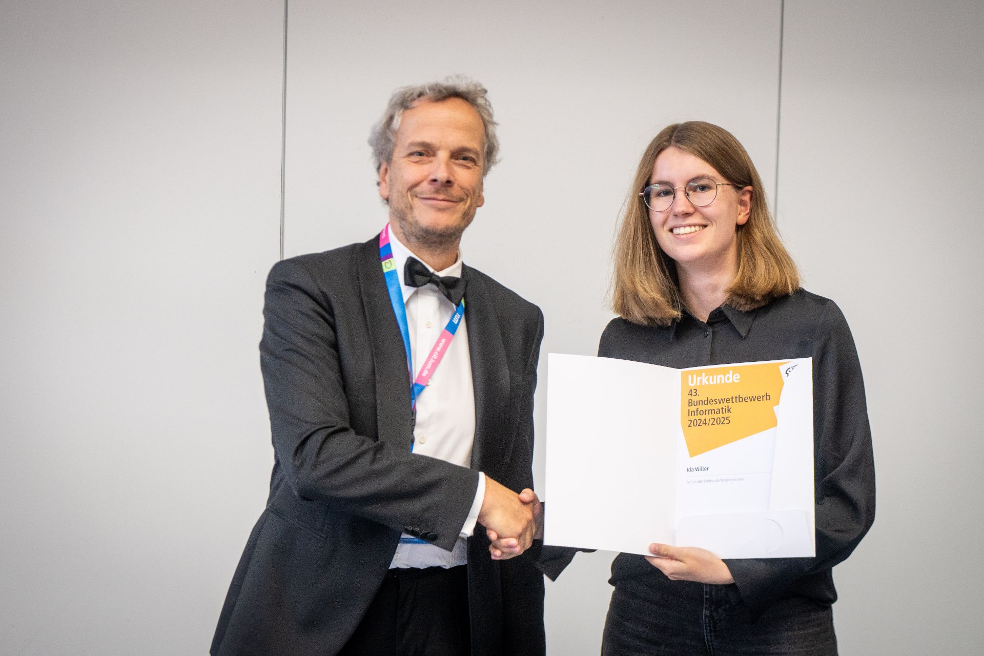 Prof. Christoph Weidenbach (BWINF-Beiratsvorsitzender) nimmt die Preisverleihung vor. Neben ihm Ida Willer. (Foto: Andreas Heddergott)